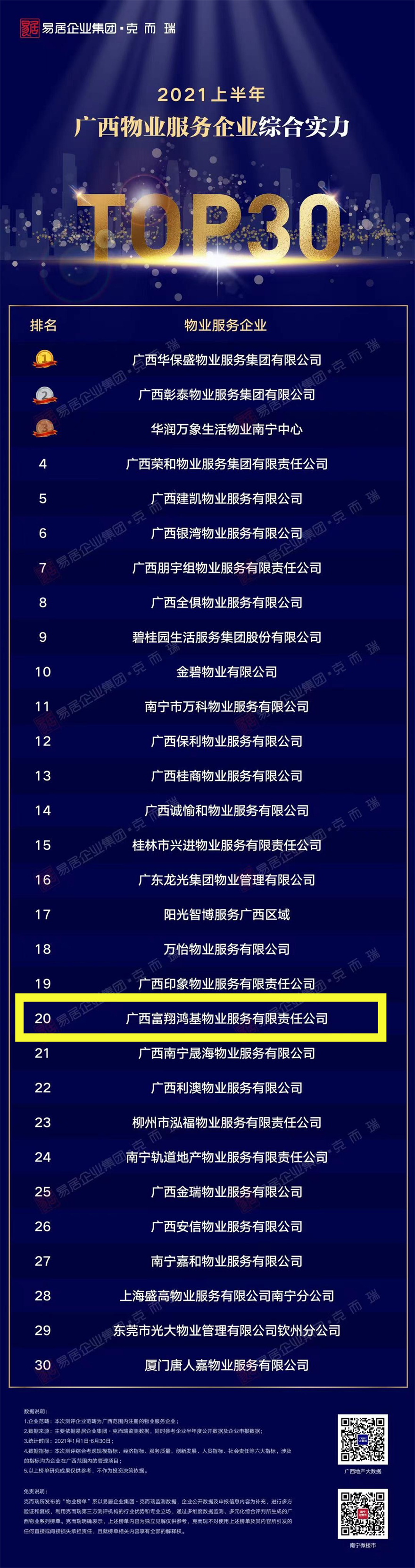 喜报||广西富翔鸿基物业荣获2021上半年广西物业林都服务企业综合实力20强