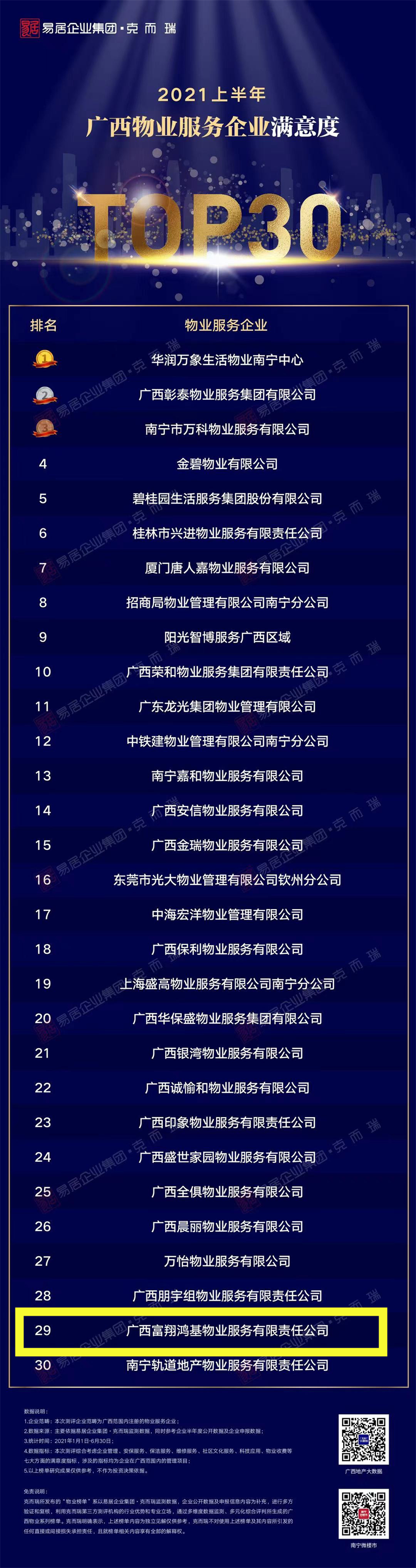 荣获“2021上半年广西物业服务企业满意度第29”!