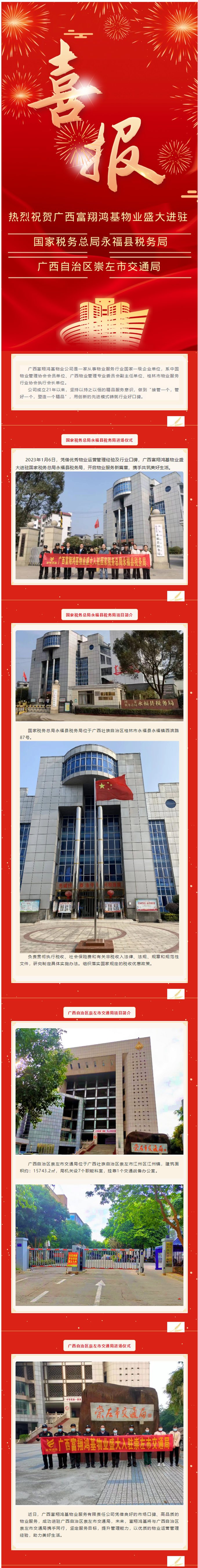 喜报|热烈祝贺广西富翔鸿基物业盛大(dà)进驻国家(jiā)税务总局永福服章县税务 局、广西自治区崇左市交通(tōng)局